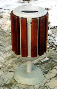 Zierbelattung aus lasiertem Merantiholz. Die Papierkorbfüße sind aus Beton, schwere Ausführung. Er ist in allen RAL-Farben
