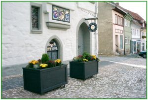Die Blumenkübel vor dem historischem Rathaus verleihen dem Marktplatz ein freundliches Aussehen. Auf dem monoton wirkenden grauen Pflastersteinen bilden sie kleine grüne Oasen, welche das Auge erfreuen und zum Verweilen einladen.